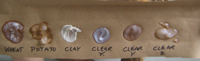 To demonstrate just how widely varied the wet out times of different pastes are,  I have included below a photo of a brown paper shopping bag. On the bag I placed dollops of wheat paste, potato starch paste, clay, and some premixed clears from various makers.