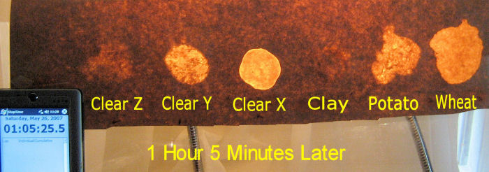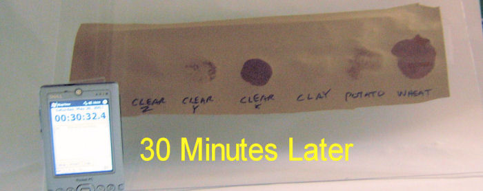 Several years ago I did a similar test using another brand of clay.  At that time, the clay wet out the brown paper in about 5 minutes.  In the new test the clay proved itself to be surprisingly gelly and radically different in nature from the clay in the previous test.